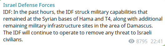 Об'єкти, за якими бив Ізраїль, "являли загрозу ізраїльському цивільному населенню". На вказаних авіабазах удари були направлені по злітно-посадкових смугах, складах палива та радарах, повідомили у ЦАХАЛ.