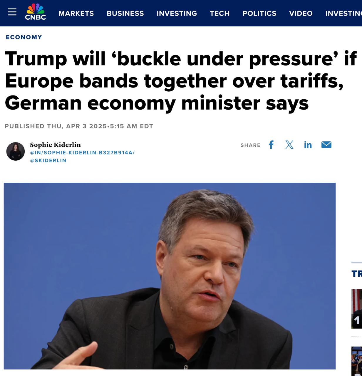 Також міністр економіки Німеччини Роберт Хабек загрожує Трампу, що Європа об'єднається з іншими країнами, щоб відповісти на мита США.