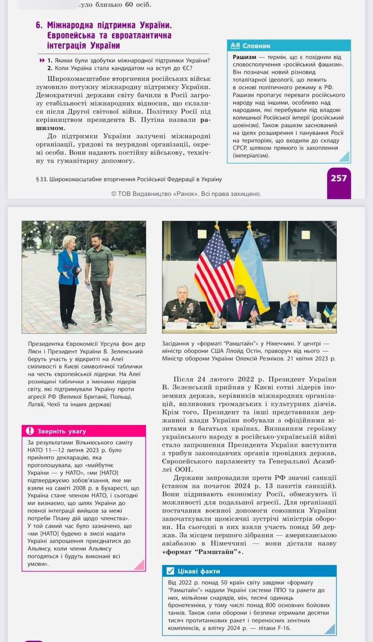 Наприкінці цього розділу (в ньому описані події до 2024 року) школярам пропонують обговорити, що заважає Україні стати членом ЄС та НАТО.