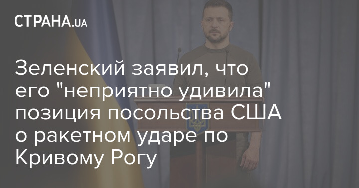 Президент Володимир Зеленський заявив, що його "неприємно здивувала" позиція посольства США в Україні щодо вчорашнього ракетного удару Кривого Рогу.