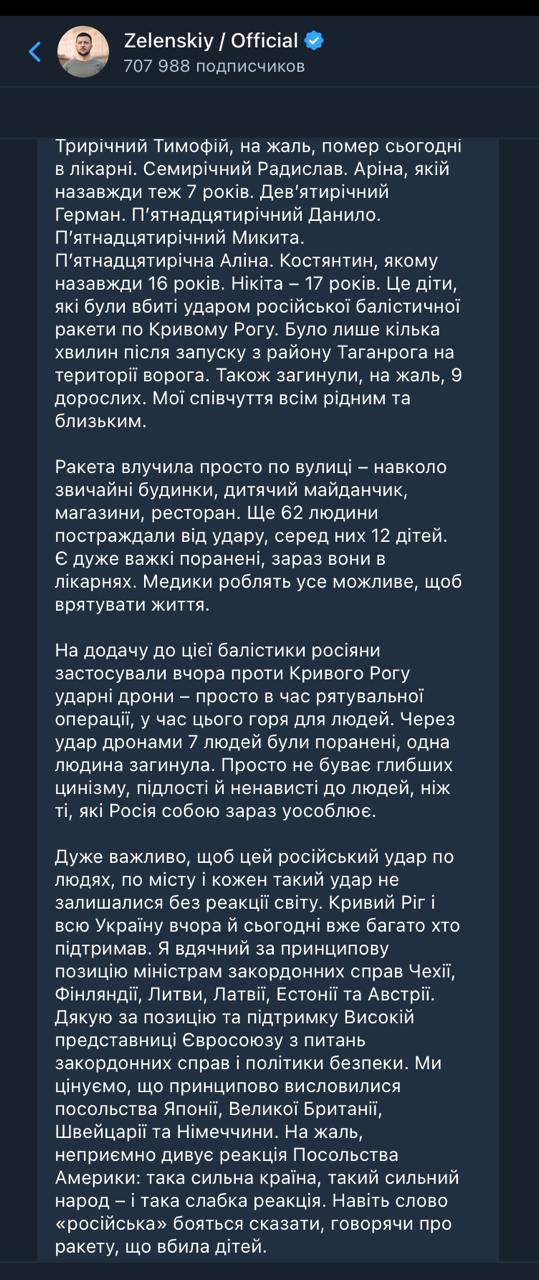 "На жаль, неприємно дивує реакція посольства Америки: така сильна країна, такий сильний народ - і така слабка реакція. Навіть слово "російський" бояться сказати, говорячи про ракету, яка вбила дітей", - написав Зеленський.