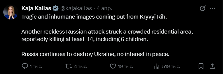 Українська влада удар по Кривому Рогу зараз подає як аргумент на користь необхідності посилення тиску на РФ, оскільки Москва "не хоче закінчувати війну". Саме такий меседж українська влада намагалася донести до США ще до трагедії у Кривому Розі. І ці зусилля після російського удару по місту різко зросли. Траур оголосили не лише у Кривому Розі, а й у низці інших міст по всій Україні.