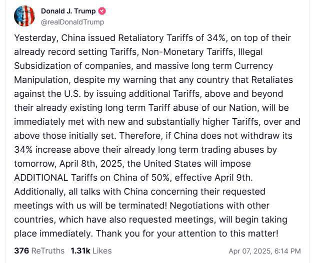 "Якщо Китай до завтра, 8 квітня 2025 року, не скасовує збільшення на 34% над торгівельними зловживаннями, що вже продовжуються, Сполучені Штати введуть додаткові тарифи на Китай у розмірі 50%, починаючи з 9 квітня. Крім того, всі переговори з Китаєм з приводу запитуваних ними зустрічей".