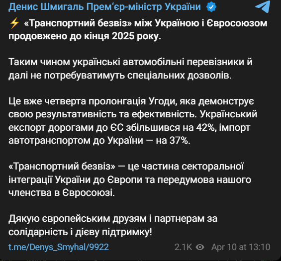 "Це вже четверта пролонгація Угоди, яка демонструє свою результативність та ефективність. Український експорт дорогами до ЄС збільшився на 42%, імпорт автотранспортом в Україну - на 37%", - пише прем'єр.