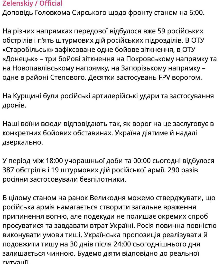 За його словами, у період між 18:00 вчорашньої доби та 00:00 сьогодні сталося 387 обстрілів та 19 штурмових дій російської армії. 290 разів росіяни застосовували безпілотники. З початку сьогоднішньої доби було 5 штурмових дій російської армії та 59 обстрілів.