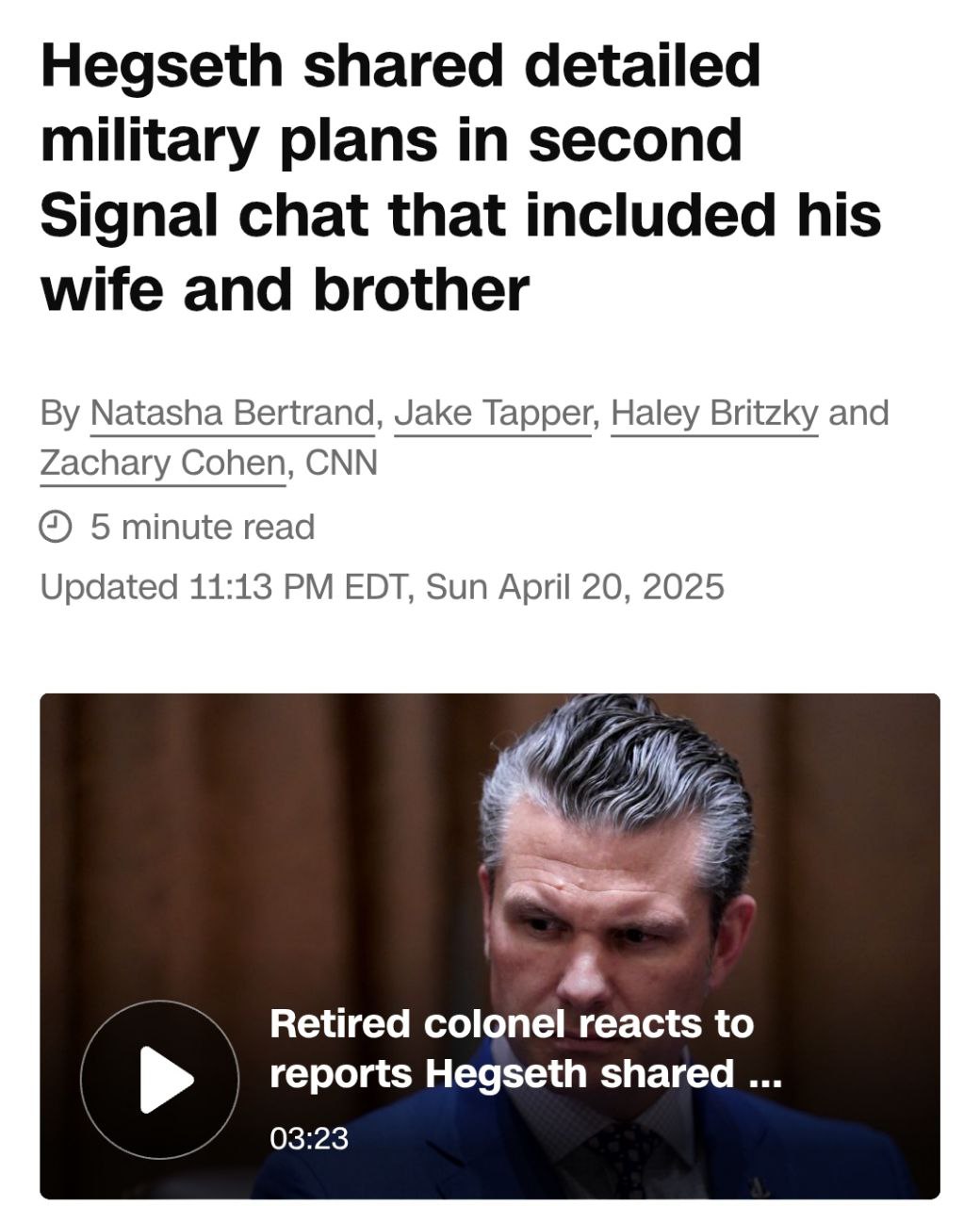 Паралельно CNN пише про те, що у міністра оборони США Піта Хегсета знайшли ще один чат у месенджері Signal, де він обговорював деталі ударів по єменських хусітах, і куди мали доступ родичі глави Пентагону – зокрема, його дружина та брат.