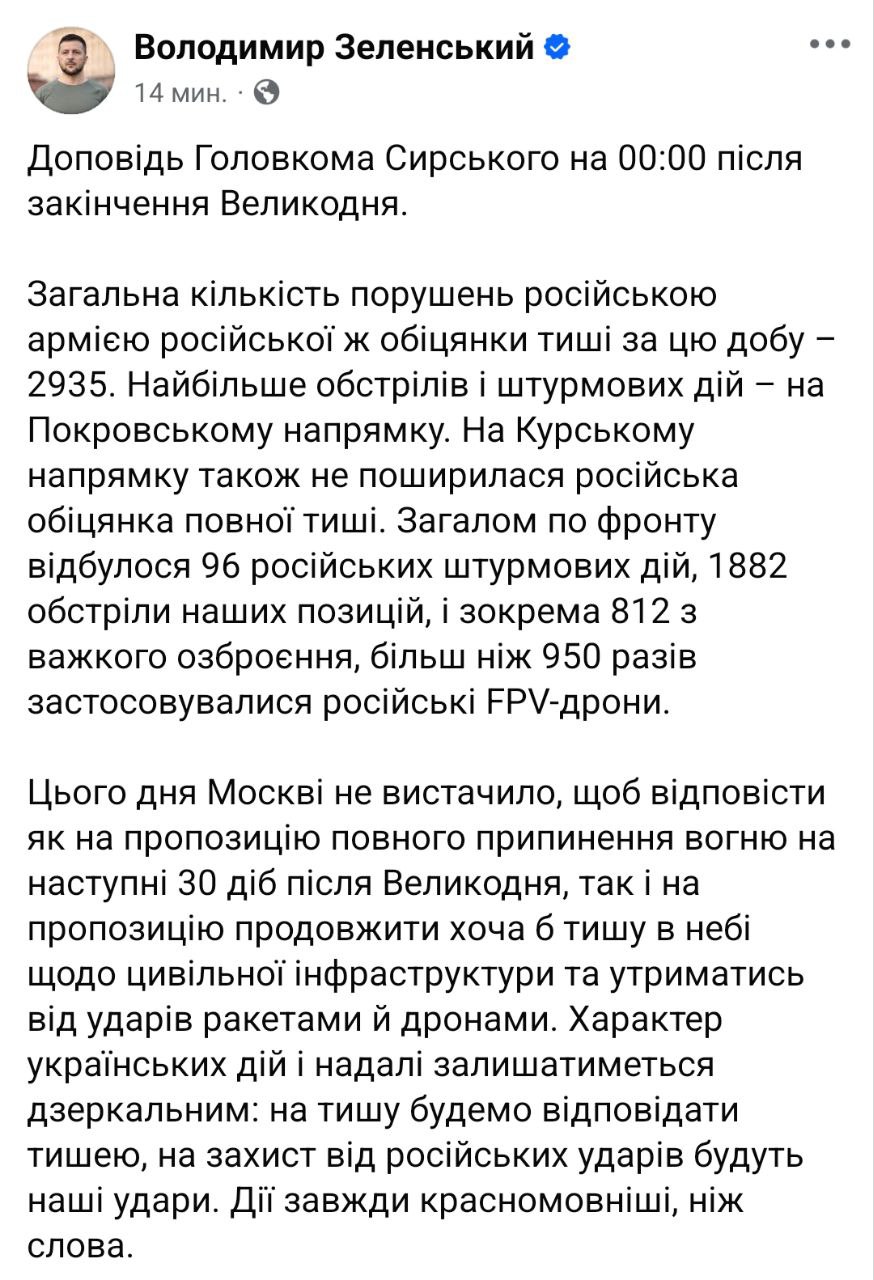 Це сталося після закінчення терміну великоднього перемир'я. До цього Росія повітряних атак не проводила (що раніше визнав і Зеленський ). Тобто фактично перемир'я скінчилося.