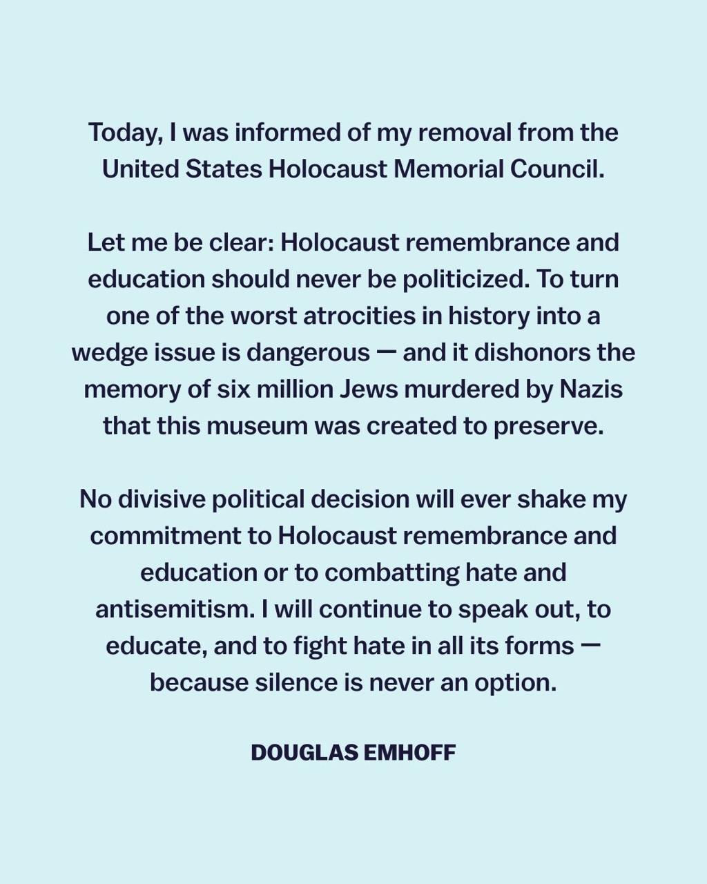 "Пам'ять про Голокост і освіту в цій сфері ніколи не повинні ставати предметом політизації. Перетворювати один із найжахливіших злочинів в історії людства на предмет суперечок небезпечно і ображає пам'ять про шість мільйонів євреїв, убитих нацистами, яку цей музей має зберігати", – написав Емхофф.