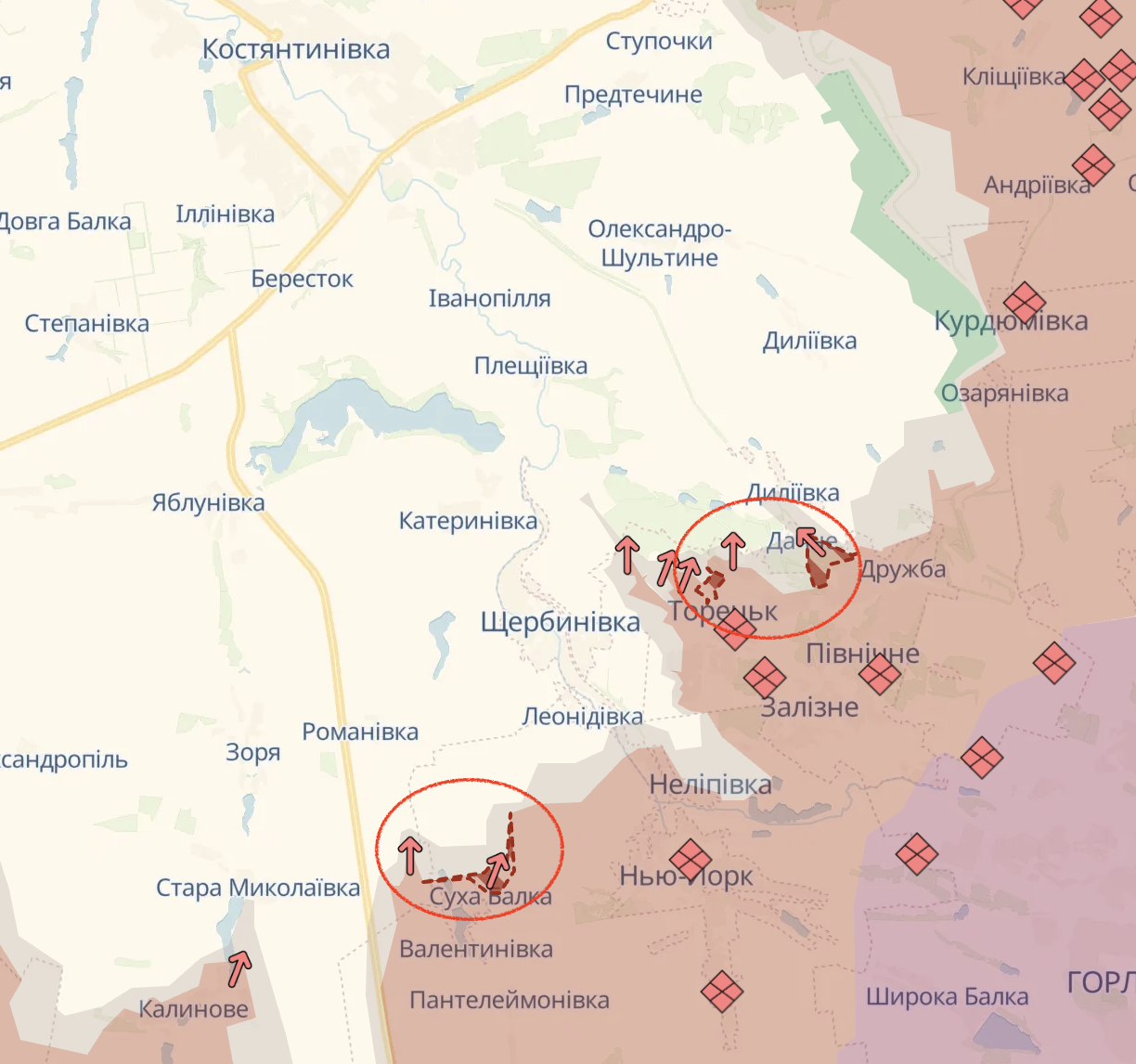 Росіяни захопили село Суха Балка на південь від Костянтинівки. А також просунулися в сусідньому Торецьку та Дачному.