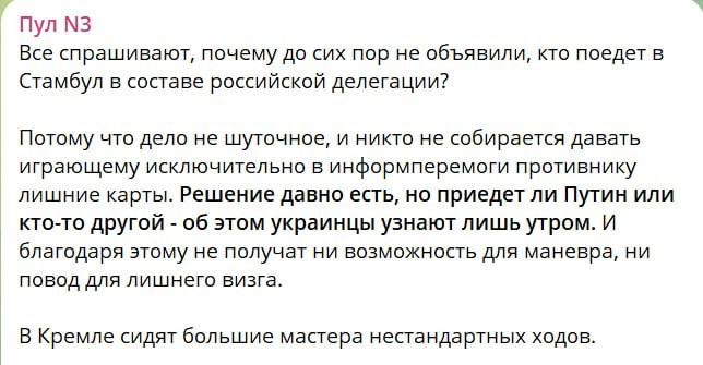 Журналіст кремлівського пулу Дмитро Смирнов повідомив, що склад делегації для переговорів з Україною у Стамбулі Кремль оголосить лише завтра вранці.