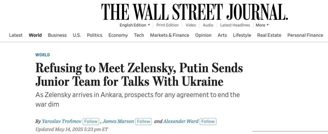 The Wall Street Journal із посиланням на українських чиновників повідомляє, що українська делегація у Стамбулі планує обговорити з російською стороною оголошення 30-денного перемир'я та подальший контроль за ним.