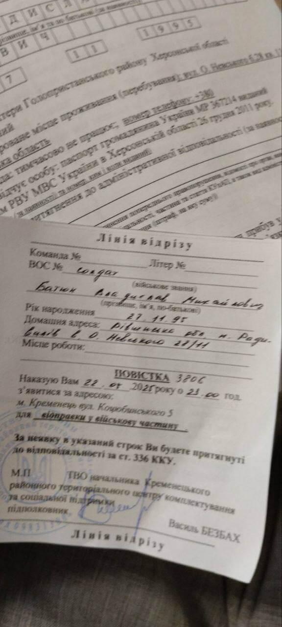 Йому видали бойовий порядок денний з вимогою з'явитися у військкомат того ж дня о 23:00.