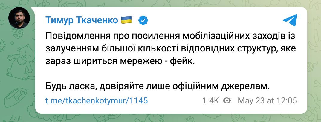 "Повідомлення про посилення мобілізаційних заходів із залученням більшої кількості відповідних структур, яке зараз поширюється по мережі - фейк", - написав він.