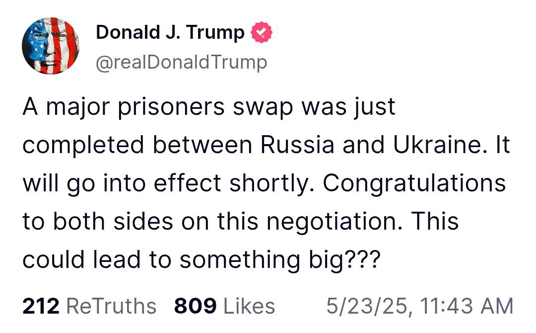 "Між Росією та Україною щойно відбувся великий обмін полоненими. Він набуде чинності найближчим часом. Вітаю обидві сторони з досягненням цієї домовленості. Чи може це призвести до чогось більшого?", - написав Трамп у своїй соцмережі.