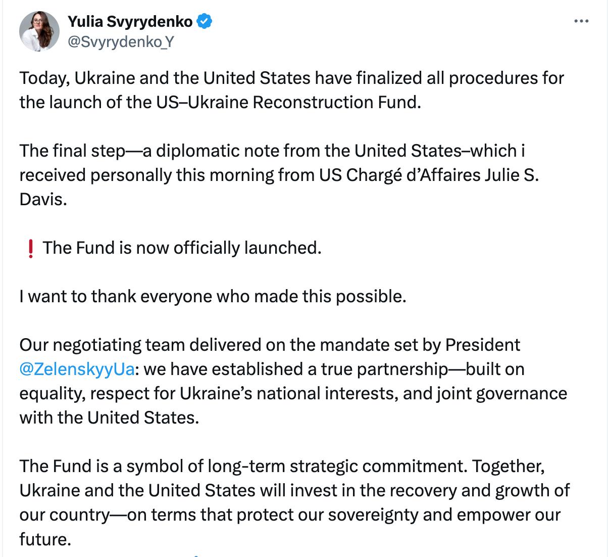 "Останнім кроком була дипломатична нота від США. Сьогодні отримала її від тимчасової повіреної у справах США в Україні Джулі Девіс. Тепер можна офіційно вважати, що фонд запущено. Є рівноправне партнерство, яке поважає національні інтереси України, передбачає спільне з Америкою управління та інвестування. написала чиновниця.