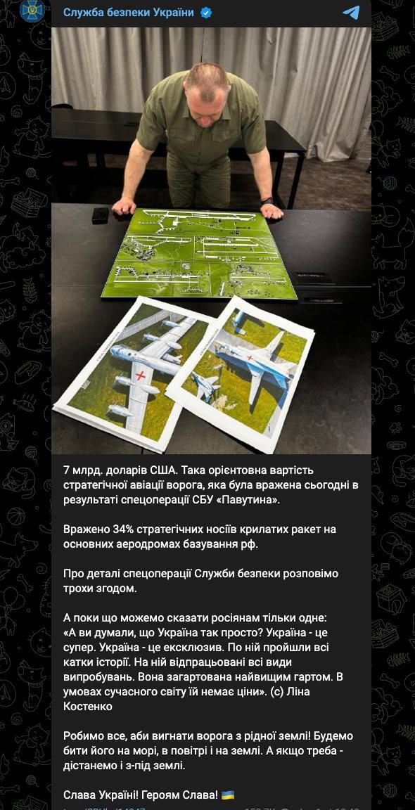 У ході сьогоднішньої атаки українських дронів на російські аеродроми було виведено з ладу 34% стратегічних бомбардувальників РФ.
