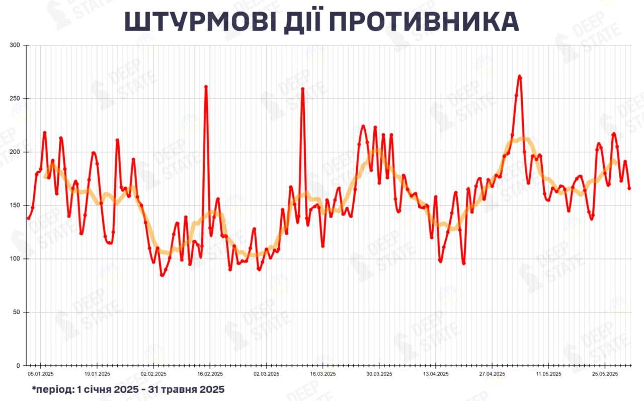 У квітні росіяни лише двічі на добу проводили понад 190 атак, а у травні таких днів було вже тринадцять. Найважчим днем було 4 травня, коли РФ здійснила 269 штурмових дій.