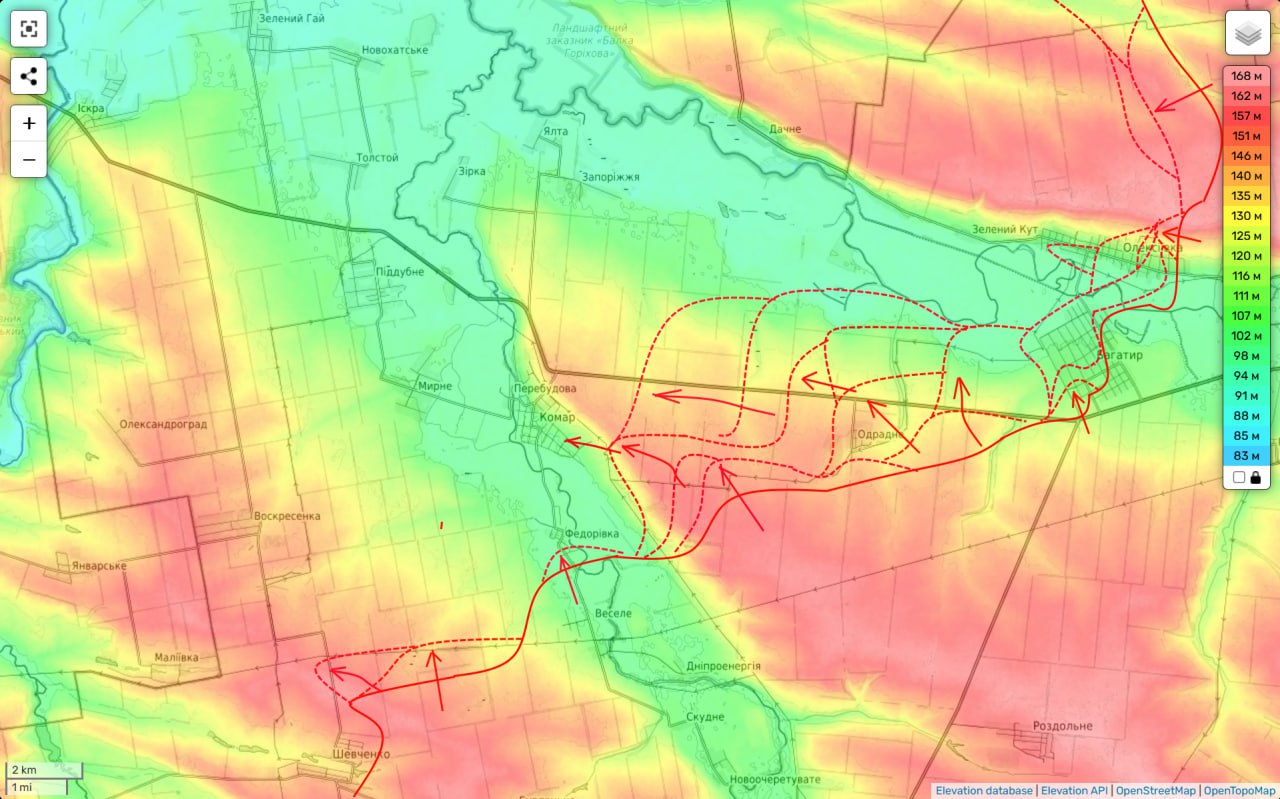 Також російські паблики стверджують, що їхні війська сьогодні зайшли на територію Дніпропетровської області на захід від села Оріхове і закріпилися там. Україна цього не підтверджувала. На карті Deep State, фронт у районі Горіхового не змінився, а саме село лише частково у сірій зоні.