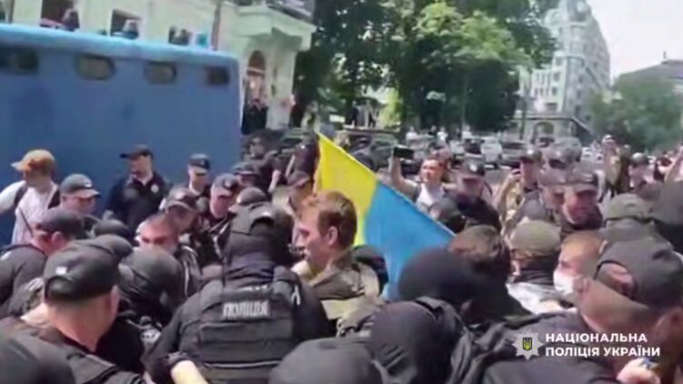 Поліція Києва опублікувала відео сутички із противниками ЛГБТ учора у Києві. Заявляється, що під час бійки один з опонентів ударив поліцейського протезом руки.