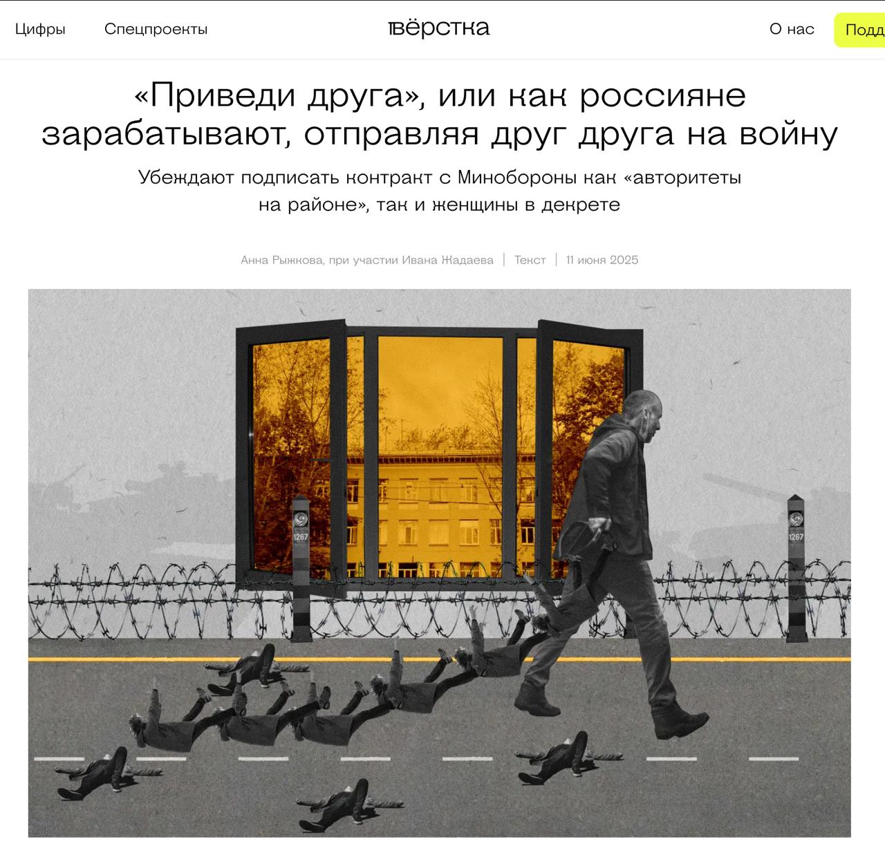 "За три роки війни вербування росіян на фронт перетворилося на живий ринок, де за одним підписаним контрактом може стояти замовник і виконавець. Тисячі чоловіків, йдучи воювати, закривають собою KPI (ключові показники ефективності - Ред. ) регіональних і міських відомств і підприємств - і часто не замислюються про це. Листя пости в тілі. "СВО", чоловік може не знати, що за нього як за клієнта прямо зараз конкурують "вербувальники". Це можуть бути колишні HR-менеджери, які почали співпрацювати з військкоматами через посередників. пише видання.