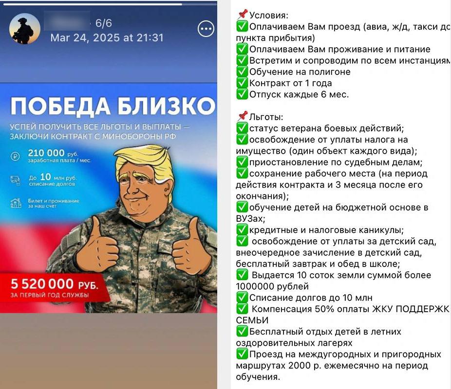 Іноді вербувальники обіцяють тим, хто погодився підписати контракт, допомогти з переведенням на тилову посаду чи оператори БпЛА, хоча й уточнюють, що гарантій немає. Інші рекрутери переконують чоловіків, що "перемога близька", і потрібно встигнути отримати всі пільги. Багато хто каже, що сплатить квитки на потяг та літак, житло та триразове харчування на час проходження медкомісії — для цього достатньо згоди приїхати та підписати контракт.