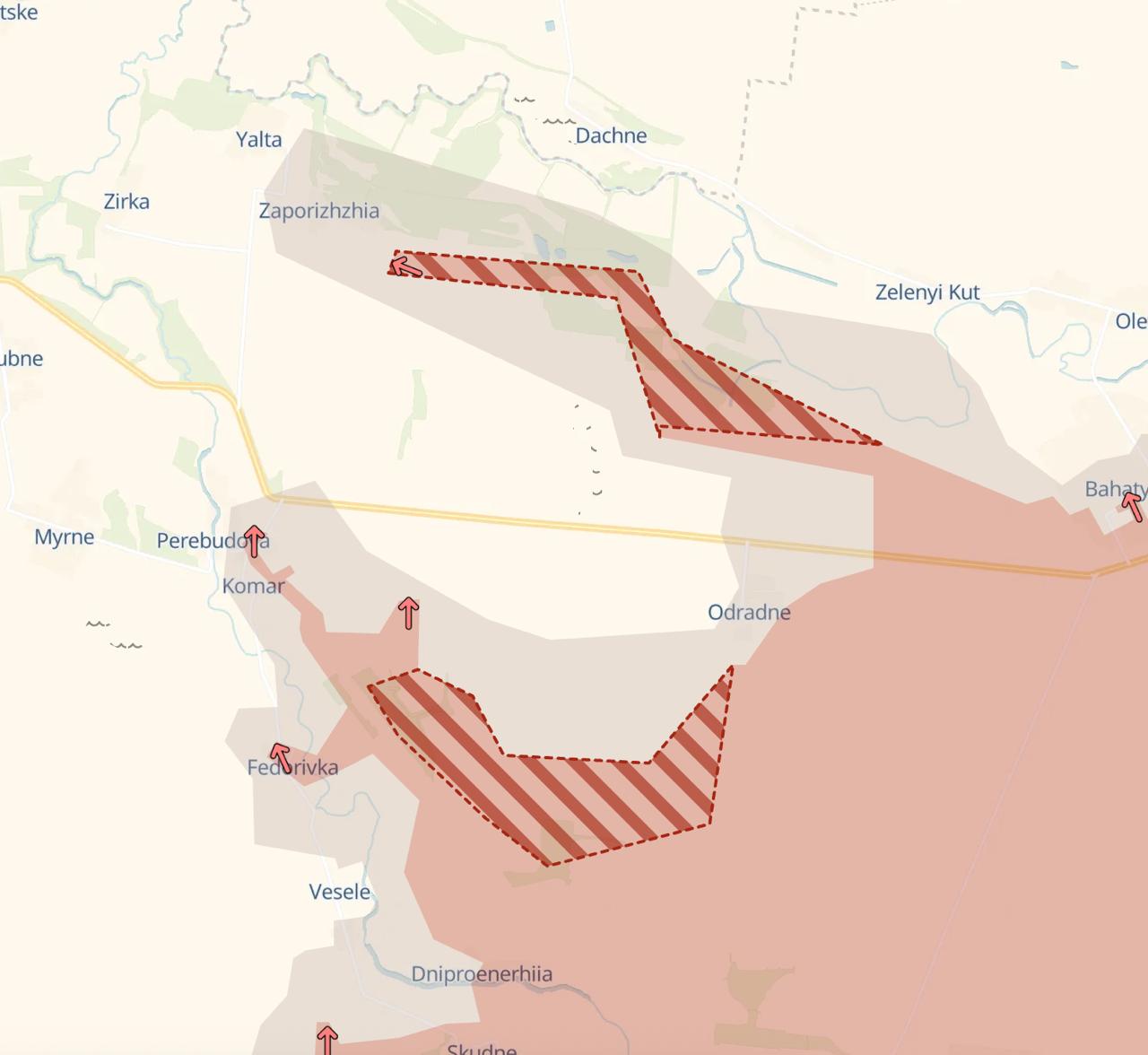 На південь від РФ зафіксовано просування в районі Комара та Одрадного, що утворює "мішок" вздовж траси на Запорізьку область.