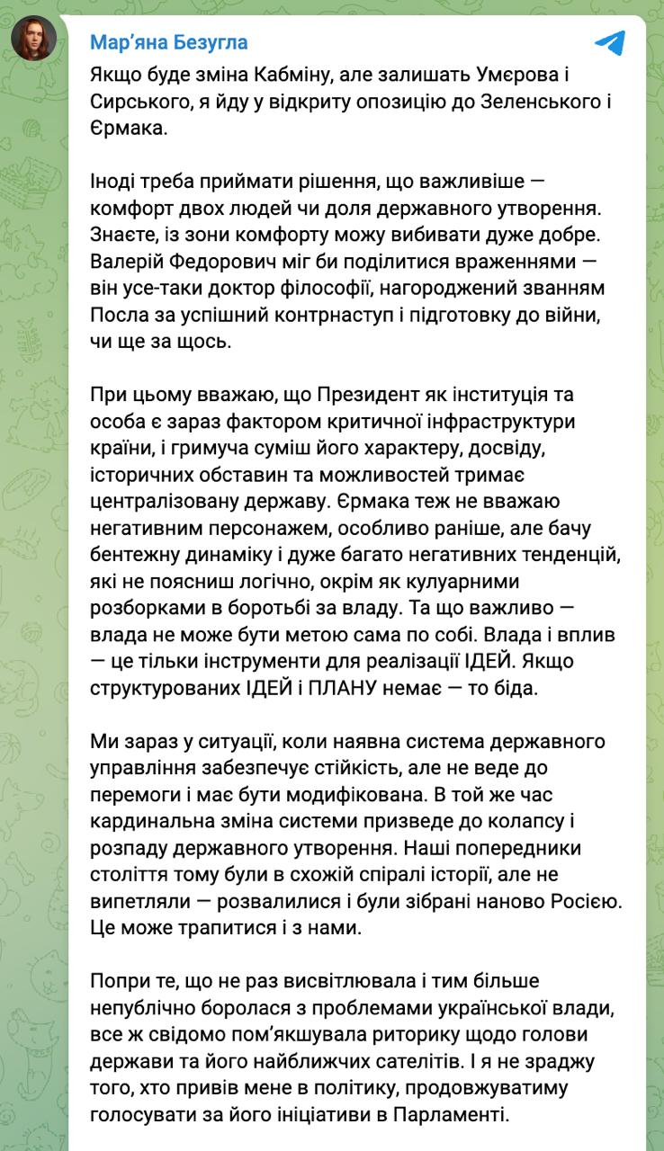 Вона вимагає відправити у відставку не лише прем'єра Дениса Шмигаля, а й міністра оборони Рустема Умерова та головкома ЗСУ Олександра Сирського, інакше погрожує перейти "у відкриту опозицію до Зеленського та Єрмака".