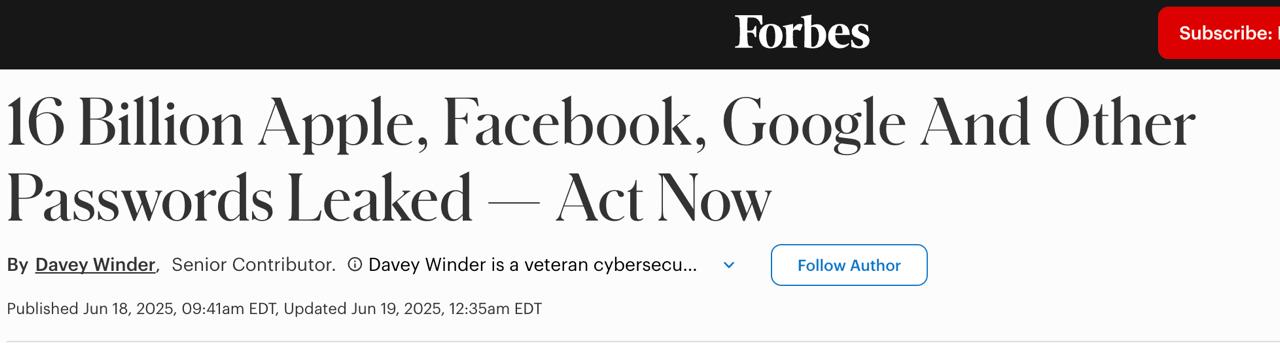 Найбільший витік даних в історії. Forbes повідомляє, що розкрито майже 16 мільярдів облікових даних.