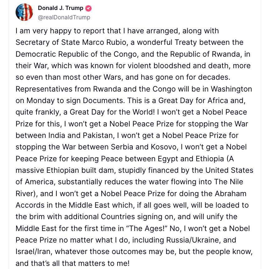 "Я не отримаю Нобелівську премію миру, що б я не робив, включаючи Росію/Україну, Ізраїль/Іран, хоч би якими були ці результати, але люди знають, і це все, що має для мене значення", - написав Трамп.