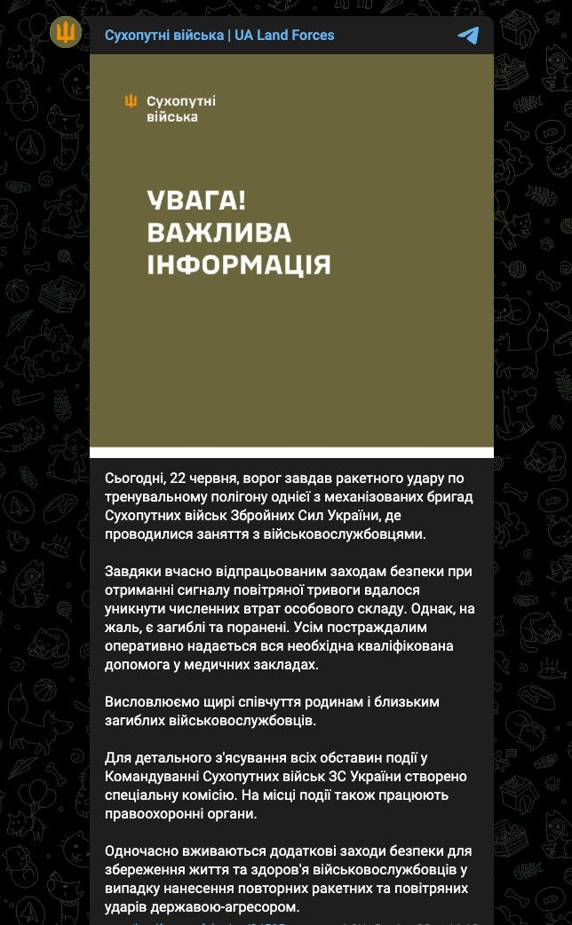 Сьогодні, 22 червня, війська РФ завдали ракетного удару по навчальному полігону однієї з механізованих бригад ЗСУ, де проходили заняття з особовим складом.