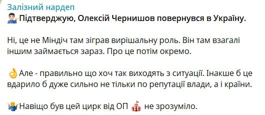"Підтверджую, Олексій Чернишов повернувся в Україну", - написав Железняк.