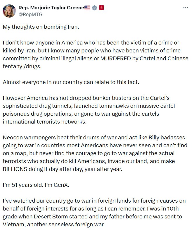 Конгресвумен Марджорі Тейлор Грін заявила, що США повернулися до іноземних конфліктів, зміни режимів і третьої світової війни лише через півроку після приходу Трампа до влади.