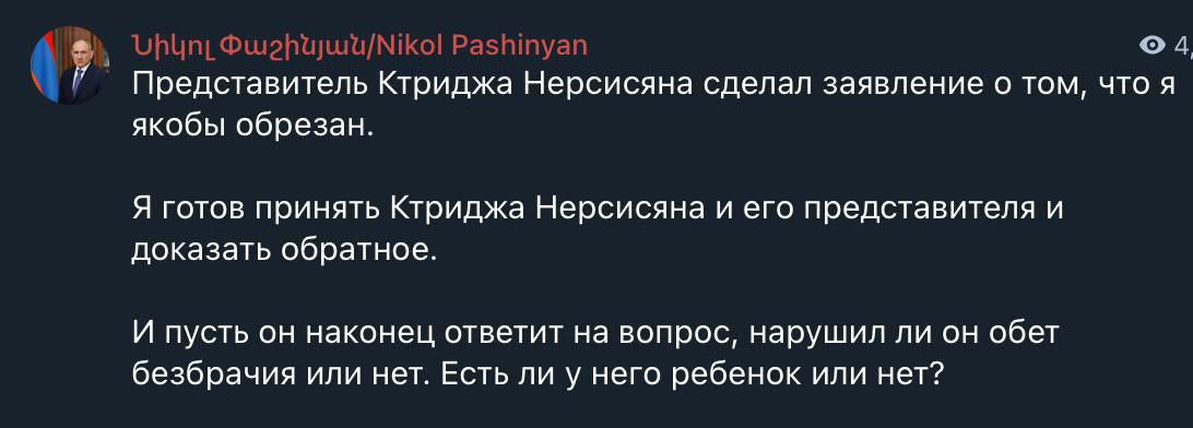 Прем'єр-міністр Вірменії Нікол Пашинян виявив бажання показати свій член патріарху Вірменської апостольської церкви (ААЦ) Гарегіну II.