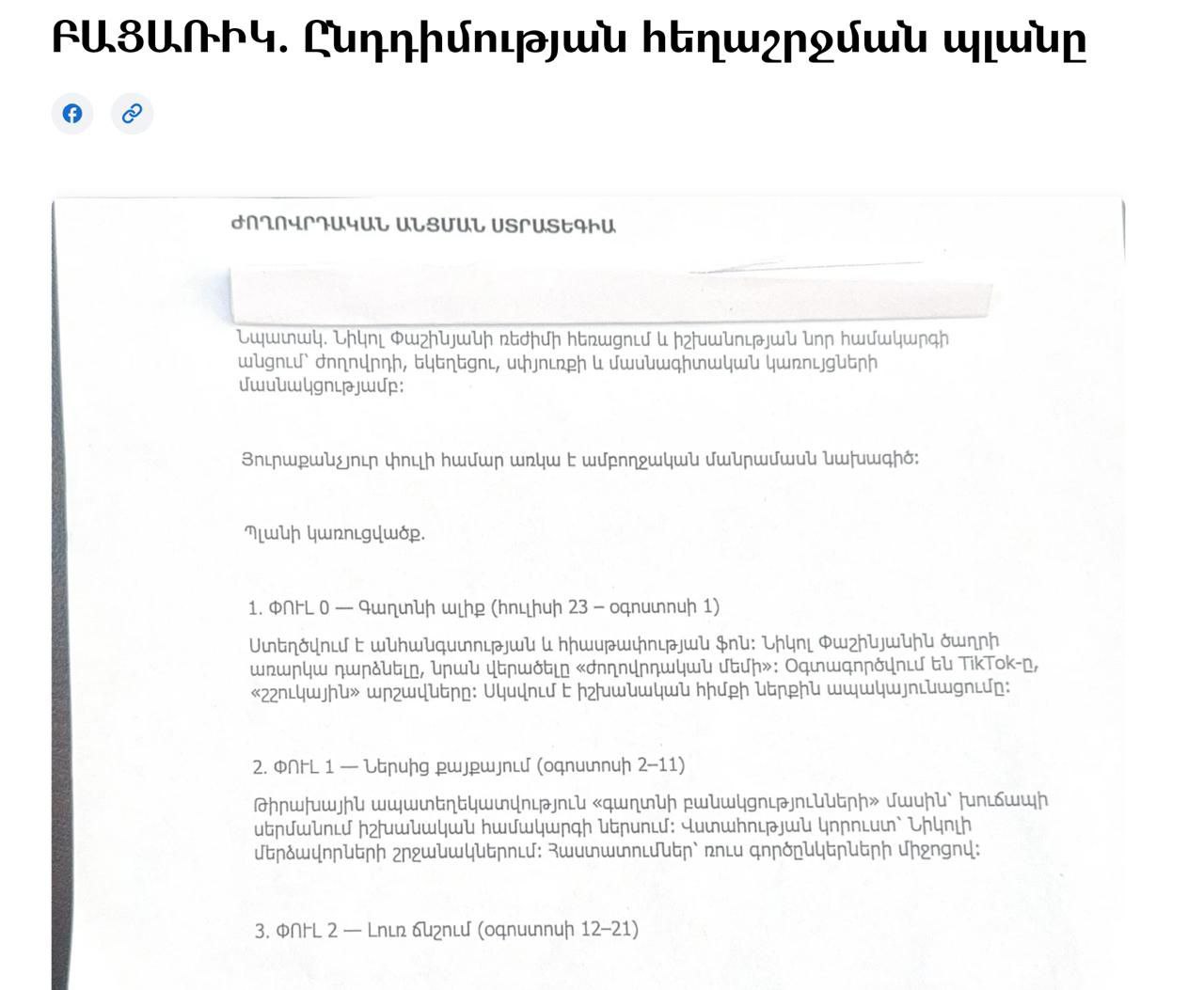 Як стверджується в документі, план розроблений опозиційними силами та спрямований на повалення Пашиняна. Серед згаданих учасників - екс-президенти Роберт Кочарян та Серж Саргсян, згаданий вище Самвел Карапетян, які належать росіянам компанії "Газпром Вірменія" та Південно-Кавказька залізниця, а також представники Вірменської апостольської церкви.