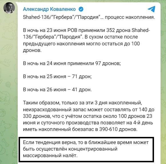 За його підрахунками, з урахуванням трьох днів без ударів та попередніх накопичень у РФ може бути до 600 "зайвих" дронів, які вона може використати найближчими днями.