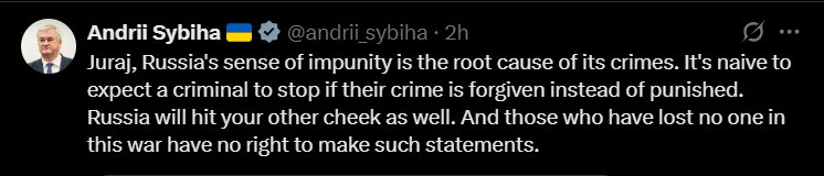 "Юрай, почуття безкарності Росії є основною причиною її злочинів. Наївно очікувати, що злочинець припинить свої дії, якщо його злочин прощають, а не карають. Росія вдарить і по іншій щоці. А ті, хто не втратив нікого у цій війні, не мають права робити такі заяви", - написав Сибіга.