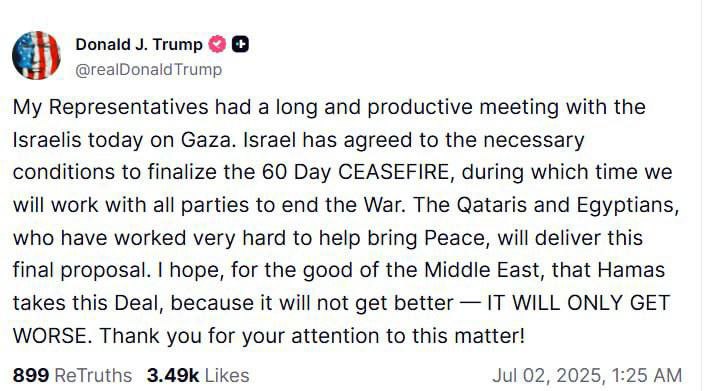 Зазначається, що тепер остаточну пропозицію передадуть Катар та Єгипет, які "завзято працюють заради миру".