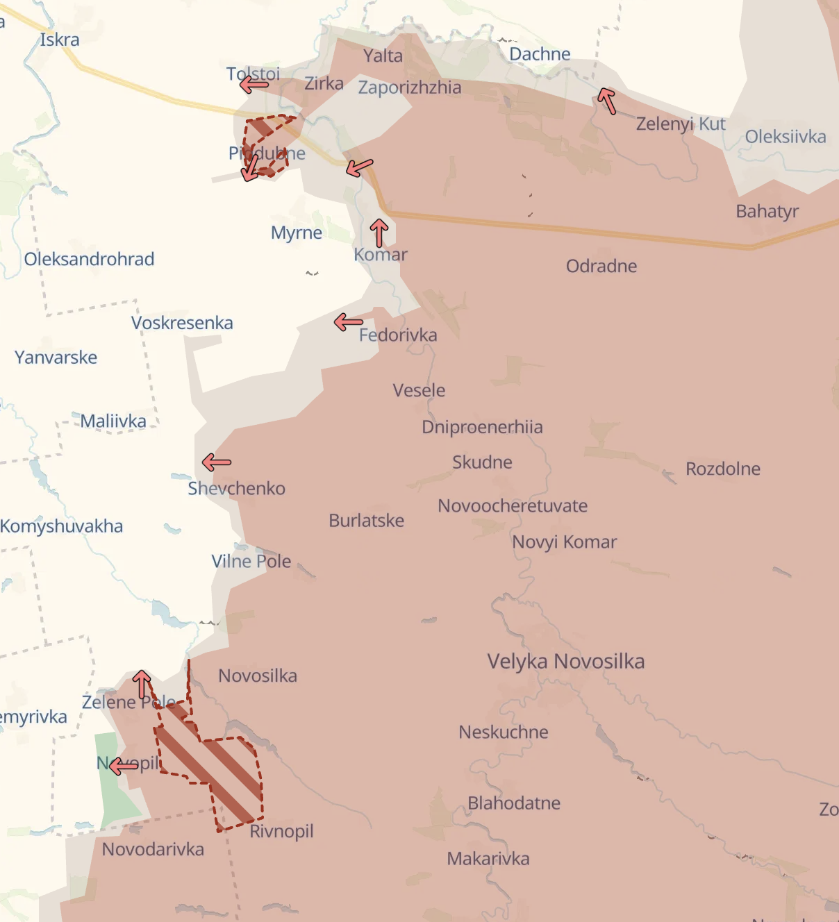 Deep State пише, що біля меж Дніпропетровської області росіяни захопили село Піддубне, а південніше просунулися біля Рівного.