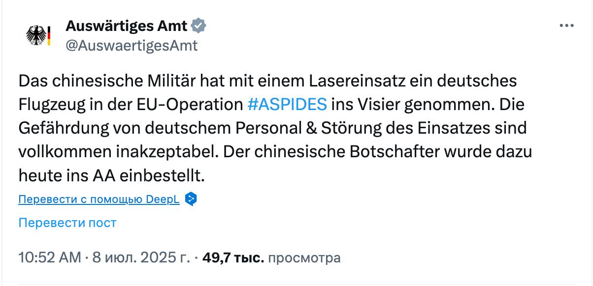 "Китайські військові використовували лазерну зброю проти німецького літака, який бере участь в операції ЄС Aspides (оборонна морська операція Євросоюзу, спрямована на забезпечення безпеки в Червоному морі та інших водах, метою якої є захист торгових суден від нападів з боку єменських хуситів і забезпечення свободи судноплавства в регіоні - Ред.). Загроза безпеки німецького персоналу та зрив операції є абсолютно неприйнятними. Сьогодні китайського посла викликали в МЗС Німеччини для пояснень", - йдеться в повідомленні МЗС.