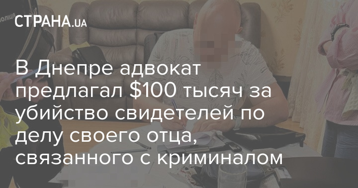 У Дніпрі адвокат запропонував 100 тисяч доларів за вбивство ключових свідків у справі проти свого батька, пов'язаного з кримінальними колами, якого звинувачують у скоєнні низки тяжких та особливо тяжких злочинів. Адвоката-сина затримали.