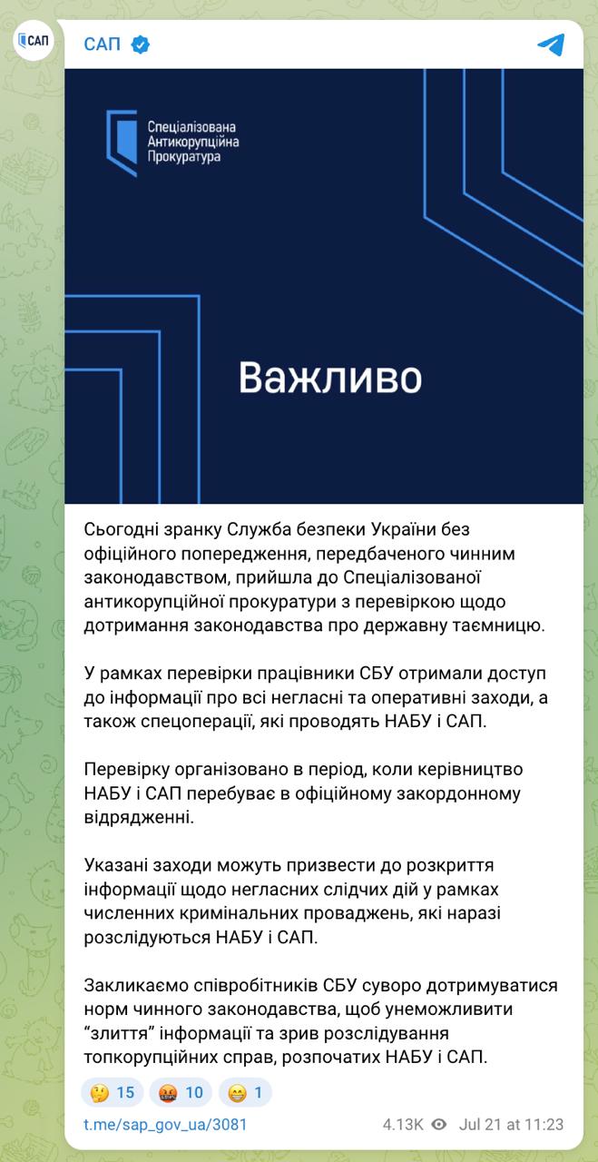 "У рамках перевірки співробітники СБУ отримали доступ до інформації про всі негласні та оперативні заходи, а також спецоперації, які проводять НАБУ та САП" - повідомляє спеціалізована прокуратура, даючи зрозуміти, що це може робитися для того, щоб організувати витік інформації фігурантам кримінальних справ: "ці дії можуть призвести до розкриття розслідувань інформації про не НАБУ та САП".