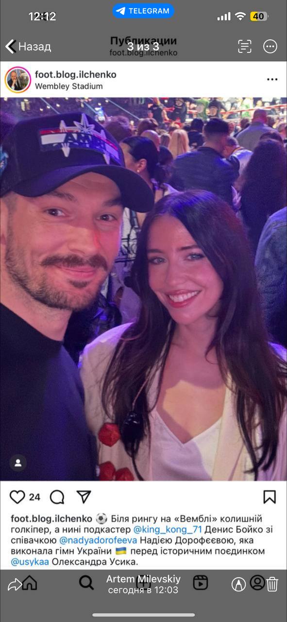 Артем опублікував фотографію, на якій Бойко позує зі співачкою Надією Дорофєєвою на "Уемблі" перед початком бою "Усик – Дюбуа", що відбувся в ніч проти 20 липня.
