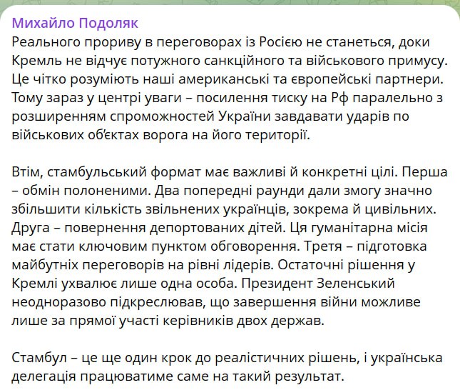 "Стамбульський формат має важливі та конкретні цілі. Перша – обмін полоненими. Два попередні раунди дозволили значно збільшити кількість звільнених українців, у тому числі і цивільних. Друга – повернення депортованих дітей. Ця гуманітарна місія має стати ключовим пунктом обговорення. приймає лише одна людина. Президент Зеленський неодноразово наголошував, що завершення війни можливе лише за прямої участі керівників двох держав.