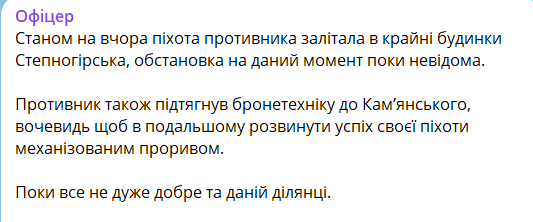 "Станом на вчора піхота противника залітала в крайні будинки Степногірська, обстановка на даний момент поки невідома. Противник також підтягнув бронетехніку до Кам'янського, вочевидь щоб в подальшому розвинути успіх своєї піхоти механізованим проривом. Поки все не дуже добре на даній ділянці".