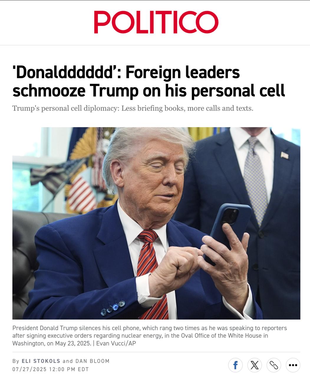 Світові лідери, які бажають зберегти прихильність Трампа, регулярно дзвонять йому та пишуть повідомлення. При цьому Трамп показує фрагменти своїх листувань іншим лідерам.