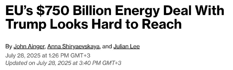 Так, агентство Bloomberg стверджує, що обіцянка Євросоюзу закупити у США енергоносіїв на 750 млрд. доларів протягом трьох років виглядає практично нереальною.