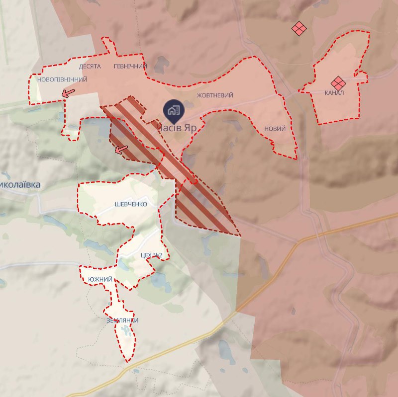 16:34 Deep State підтверджує просування РФ у Вартовому Яру, але не його повну втрату, про яку заявляє Москва. На карті українського військового паблику вказано контроль ЗСУ за південними районами міста, включаючи Шевченка та Цех №2.