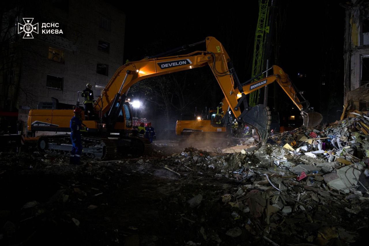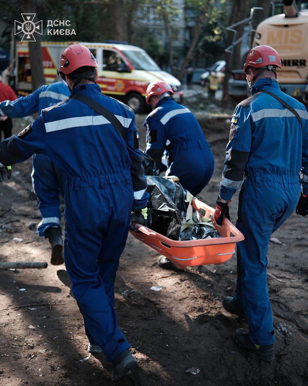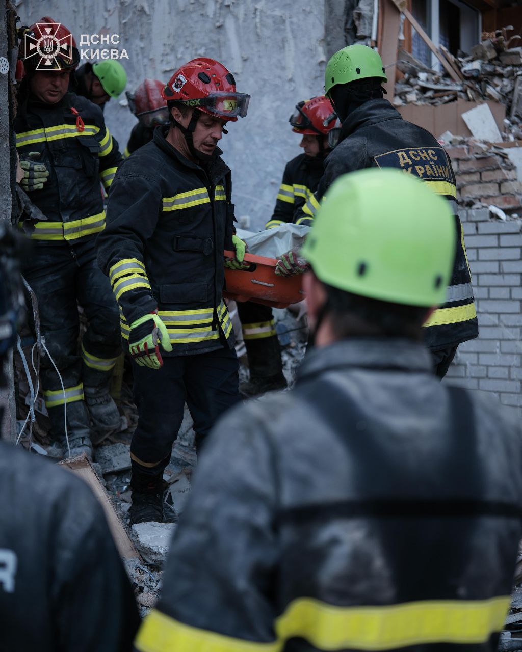 "Протягом ночі та вранці рятувальники дістали з-під завалів житлового будинку у Святошинському районі 10 тіл загиблих, серед яких дитина 2-х років", - йдеться у повідомленні.