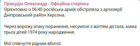 "Через ворожу атаку поранення, несумісні з життям, отримала, мама трьох дітей 1974 року народження", - написав він.