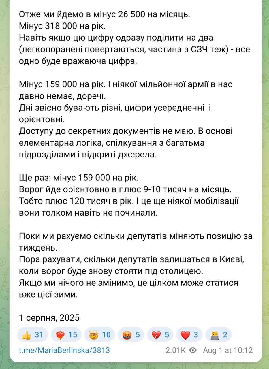 "Навіть якщо цю цифру відразу розділити на два (легко поранені повертаються, частина з СЗЧ теж) - все одно буде вражаюча цифра. Мінус 159 000 на рік. І ніякої мільйонної армії у нас давно немає, до речі. Ворог йде орієнтовно в плюс 9-10 тисяч на місяць. Поки ми вважаємо, скільки депутатів змінюють позицію за тиждень. Настав час вважати, скільки депутатів залишаться в Києві, коли ворог знову буде стояти під столицею.